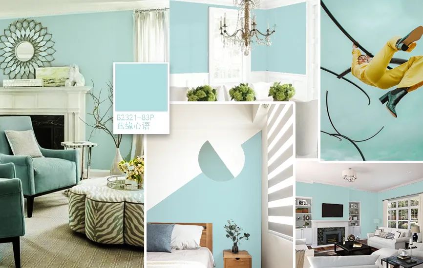 相近色也叫類似色,是運用標準色環(huán)上任何部分的45°-60°內(nèi)的色。EX:黃-黃綠-綠;紅-紅橙-橙..等,均為相近色。藍綠色系不論用在何處,皆能適度提升溫柔與優(yōu)雅,大寶設(shè)彩家刻意挑選純度調(diào)節(jié)到中等程度的B5640-73P揚帆遠航,是一淡化過后的藍色,飽和度低、明度高,搭配起來能帶給人寧靜平和的感受。當然選色處理得當,色感也更加豐富,相似色組合搭配能表達在維持原有風格的同時,讓空間視覺更有層次感。