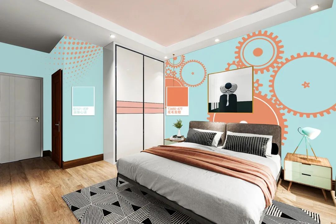 對比色彩搭配法,由于視覺感受較強烈,呈現(xiàn)出不同于單色墻面的大自然氛圍,視覺反差帶出獨特新意,整合成有趣活潑的視覺重點,但太密集使用對比色搭配,會使人眼花撩亂,盡量選定一組對比色即可,除了兩大對比色之外,細節(jié)建議搭配黑白灰的單品作為平衡。