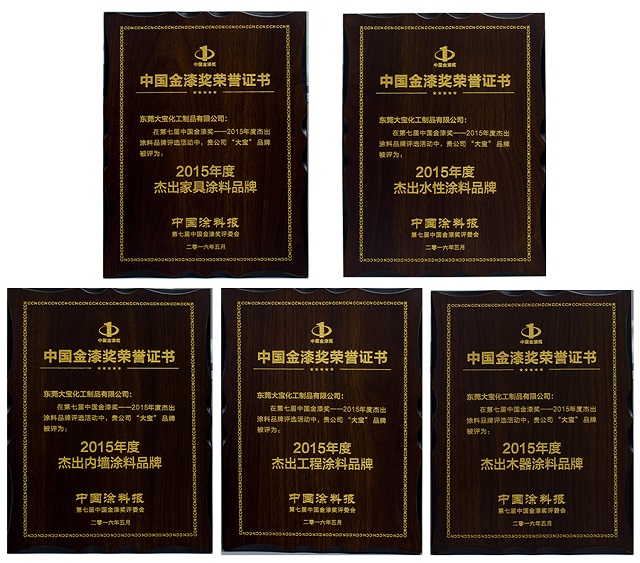 大寶漆憑借著過硬的產(chǎn)品質(zhì)量及強大的銷售業(yè)績,獲得了廣大消費者的認可,一舉獲得了“2015年度內(nèi)墻涂料杰出品牌”、“2015年度木器涂料杰出品牌”、“2015年度工程涂料杰出品牌”、“2015年度家具涂料杰出品牌”、“2015年度水性涂料杰出品牌”等五項大獎;