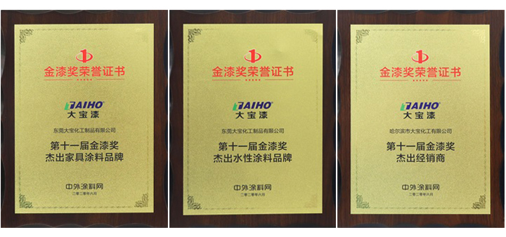 會上還揭曉了“第十一屆金漆獎”評選結(jié)果并舉行了金漆獎頒獎盛典。大寶漆再次以強大的品牌價值和影響力,得到行業(yè)的認可,一舉斬獲3項重量級榮譽,分別是“杰出家具涂料品牌”、“杰出水性涂料品牌”等獎項。同時,大寶漆哈爾濱經(jīng)銷商哈爾濱大寶獲得“杰出經(jīng)銷商”的榮譽。