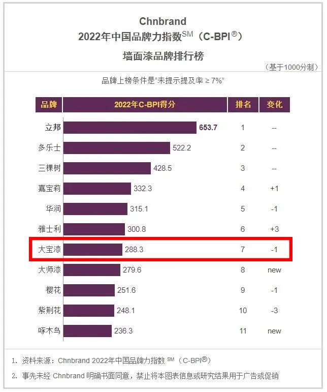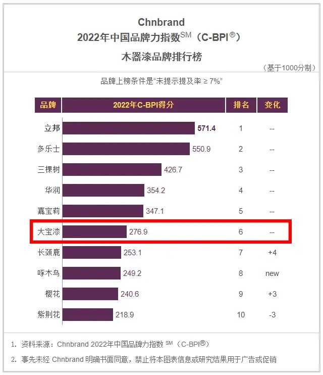 4月20日,品牌評級權威機構Chnbrand發布2022年(第十二屆)中國品牌力指數SM(C-BPI®)品牌排名和分析報告,大寶漆再次憑借優質、環保的產品與深厚的研發實力和口碑上榜。