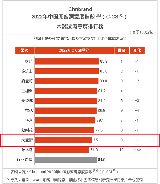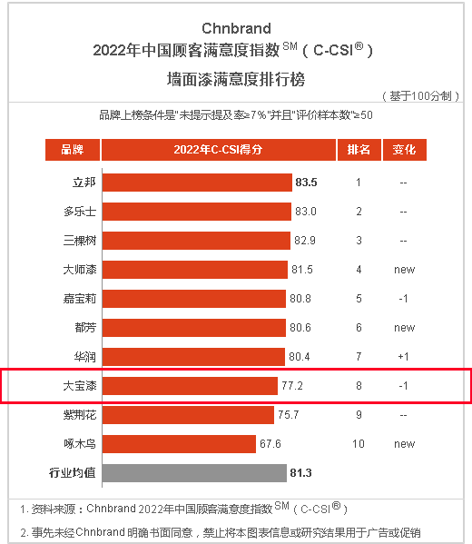 品牌建設(shè)不是一蹴而就,在4月Chnbrand發(fā)布的品牌力指數(shù)(C-BPI®)品牌排名和分析報告中,大寶漆就已入選雙榜單。此次入選中國顧客滿意度指數(shù)SM(C-CSI®)品牌排行榜,再次彰顯了大寶漆的品牌韌性。
