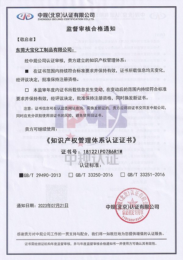 大寶化工作為國家知識產(chǎn)權(quán)優(yōu)勢企業(yè),長期致力于研產(chǎn)銷“建筑涂料、木器涂料、金屬涂料、塑膠涂料”,得益于公司重視專業(yè)、創(chuàng)新的經(jīng)營理念,致力于知識產(chǎn)權(quán)等工作的不懈努力,近期在知識產(chǎn)權(quán)工作方面取得了顯著進(jìn)展。