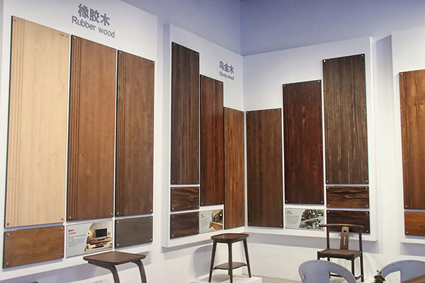 其展示精致與美學(xué)共存的色板,以黑檀、烏金木、白蠟?zāi)尽⒑诤液蛫W古曼等為代表的多種素材,呈現(xiàn)了色彩多樣化,工藝環(huán)保化趨勢(shì),滿足了用戶對(duì)于不同風(fēng)格的需求。