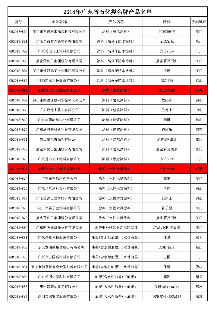 根據(jù)《廣東省名牌產(chǎn)品評價指南》標準要求,在企業(yè)自愿申報的基礎(chǔ)上,經(jīng)申報資料初審、申報數(shù)據(jù)公示、企業(yè)現(xiàn)場審查、專家綜合評價、廣東質(zhì)量品牌評審專家委員會審議確認,授予大寶化工生產(chǎn)的“大寶漆”牌涂料(詳見附件)為2018年度廣東省“石化類名牌產(chǎn)品”。