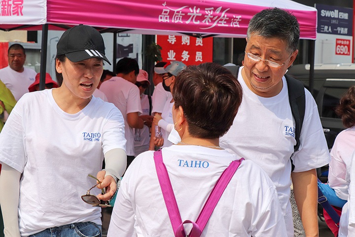 在工作人員的指引下,參賽隊(duì)伍高舉印有“大寶漆,品質(zhì)光彩生活”的旗幟徐徐前進(jìn),形成一道道亮麗的風(fēng)景線。長長的隊(duì)伍從起點(diǎn)出發(fā),沿途,大寶漆工作人員為參賽者準(zhǔn)備了飲用水補(bǔ)給,運(yùn)動愛好者們一路走走拍拍,用腳步和汗水感受運(yùn)動的樂趣。
