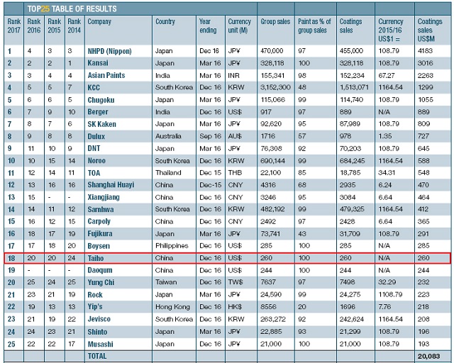 近日,由《亞太涂料雜志》公布的亞太地區涂料企業排名前25強榜單新鮮出爐,在涵蓋東亞、南亞、東南亞、中亞、澳大利亞、新西蘭、與中東地區等亞太范圍內的涂料企業中,大寶漆躋身2017年亞太地區涂料強企榜單,排名第18位,用事實數據再顯中國涂企的實力。