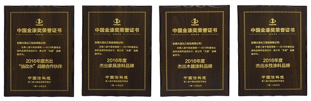 會(huì)議頒發(fā)了在多個(gè)細(xì)分渠道領(lǐng)域的2016年度杰出涂料品牌,大寶漆憑借其臻于至善的品質(zhì)及消費(fèi)者的支持,榮膺2016年度杰出“油改水”戰(zhàn)略合作伙伴、杰出木器裝修涂料品牌、杰出家具涂料品牌、杰出水性涂料品牌等4項(xiàng)大獎(jiǎng)。同時(shí),大寶漆經(jīng)銷商杭州啟納實(shí)業(yè)有限公司獲得了2016年度杰出家具涂料經(jīng)銷商獎(jiǎng)項(xiàng)。大寶漆獨(dú)攬5個(gè)獎(jiǎng)項(xiàng),收獲頗豐。