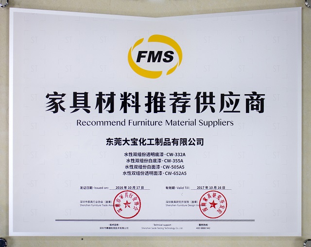 10月28日,2016深圳家具行業(yè)協(xié)會第八屆理事會第一次會員大會舉行。會上,由深圳市家具行業(yè)協(xié)會、深圳家具研究開發(fā)院聯(lián)合發(fā)起的“家具材料推薦供應(yīng)商”證書頒發(fā)儀式同期進(jìn)行。大寶漆憑借嚴(yán)苛的品質(zhì)把控、綠色環(huán)保的涂料產(chǎn)品,獲得本年度原材料企業(yè)“推薦供應(yīng)商”的榮譽。
