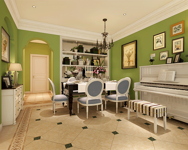 歐式田園風(fēng)格在設(shè)計(jì)上講求心靈的自然回歸感,喜歡把一些精細(xì)的后期配飾融入到設(shè)計(jì)風(fēng)格之中,體現(xiàn)一種安逸、舒適的生活氛圍。通常大量使用碎花圖案的各種布藝和掛飾,墻壁上也并不空寂,壁畫和裝飾的花瓶都使它增色不少,鮮花和綠色的植物也是很好的點(diǎn)綴。