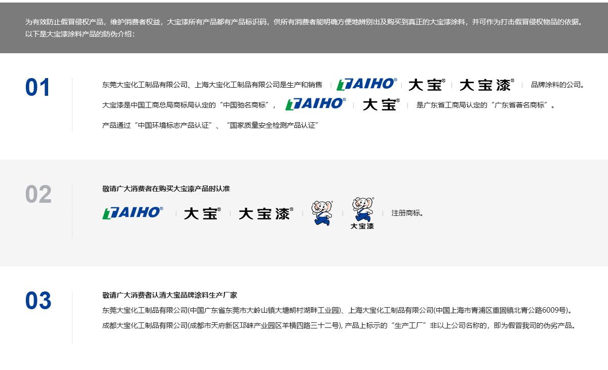 為有效防止假冒侵權產品,維護消費者權益,大寶漆所有產品都有產品標識碼,供所有消費者能明確方便地辨別出及購買到真正的大寶漆涂料,并可作為打擊假冒侵權物品的依據。以下是大寶漆涂料產品的防偽介紹: